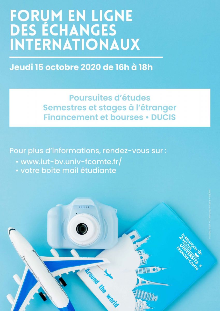 Pour la quatrième année consécutive, le service des Relations Internationales de l'IUT Besançon-Vesoul de l'université de Franche-Comté organise son forum des échanges internationaux. Compte tenu du contexte sanitaire, il se tiendra cette année en ligne.