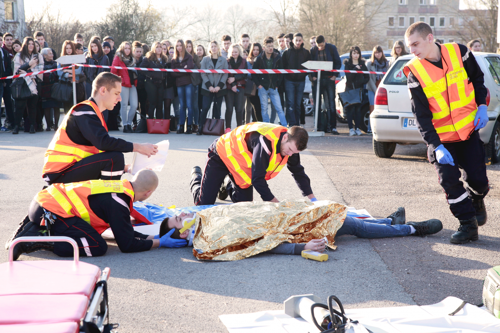 En matinée, les sapeurs-pompiers du Doubs sont intervenus pour montrer comment se déroule la prise en charge d’une personne accidentée de la route. Les étudiants ont ensuite été initiés aux gestes de premiers secours. Au cours de la journée, une dizaine d’autres activités étaient programmées, dont une collecte de sang avec l’EFS. Cinq ateliers étaient proposés par la mission handicap du CCAS de Besançon. Les étudiants ont été particulièrement touchés par le témoignage de Francis Marotel de l’Association des familles de traumatisés crâniens et cérébro-lésés (AFTC). Une autre intervenante, Catherine Ruedin, a abordé avec eux la question de la maladie psychique. Deux ateliers d’expérimentation leur ont permis de mieux comprendre le handicap : une simulation de déficience visuelle avec chien guide et canne blanche, animée par l’association Mira, et un parcours en fauteuils roulants. Les étudiants ont également été invités à un voyage dans le temps en testant le simulateur de vieillissement apporté par le CCAS.