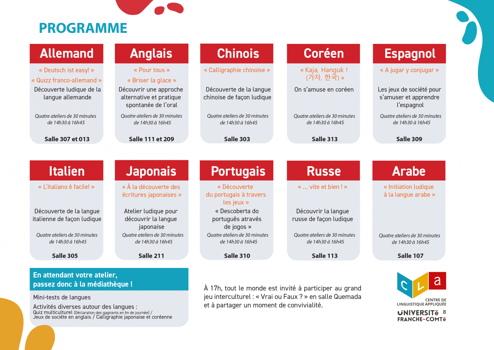 Au programme : découvrir les écritures japonaises, la langue russe, s’initier au portugais, pratique orale en anglais, découvrir l'espagnol grâce aux jeux de société, découvrir l’italien, le coréen, l’allemand tout en s’amusant…